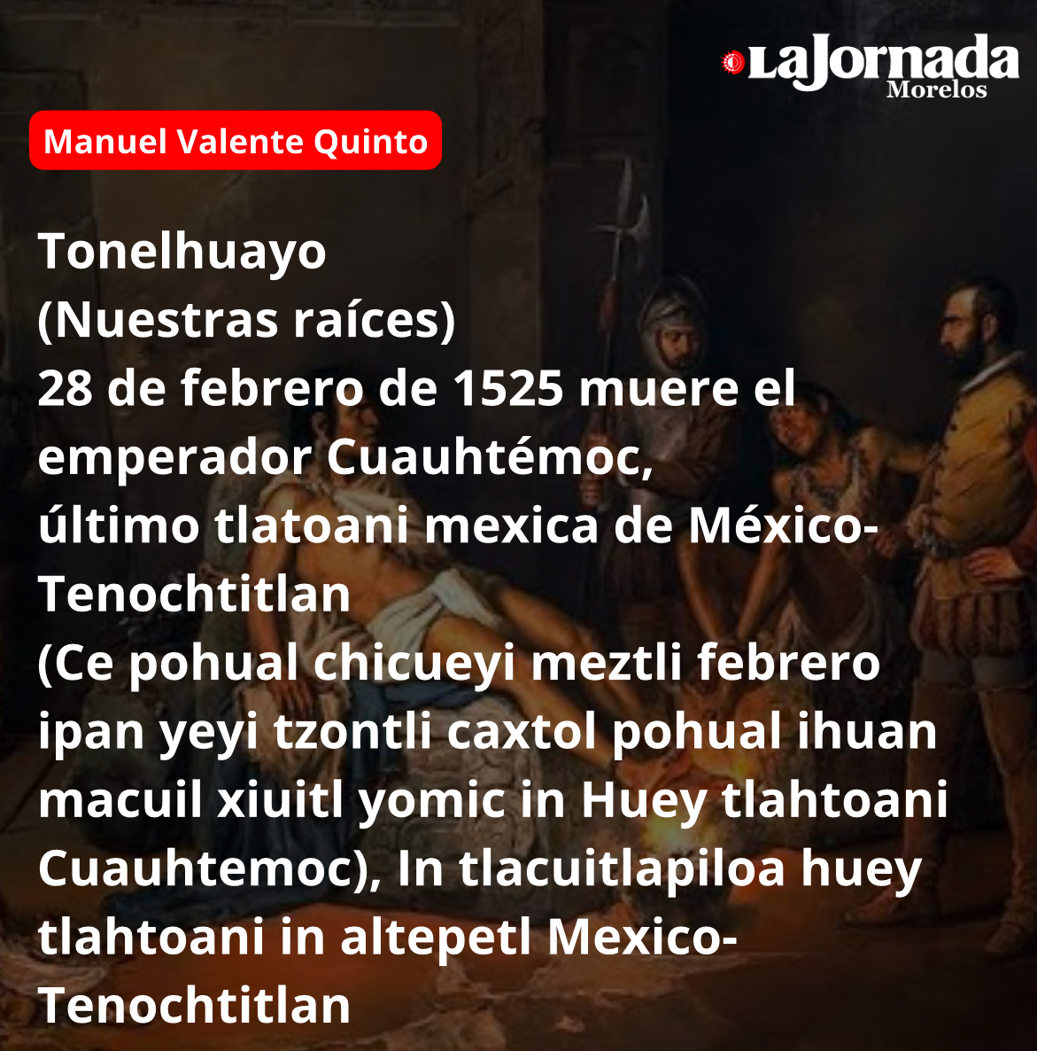 (Nuestras raíces) 28 de febrero de 1525 muere el emperador Cuauhtémoc, último tlatoani mexica de México-Tenochtitlan (Ce pohual chicueyi meztli febrero ipan yeyi tzontli caxtol pohual ihuan macuil xiuitl yomic…