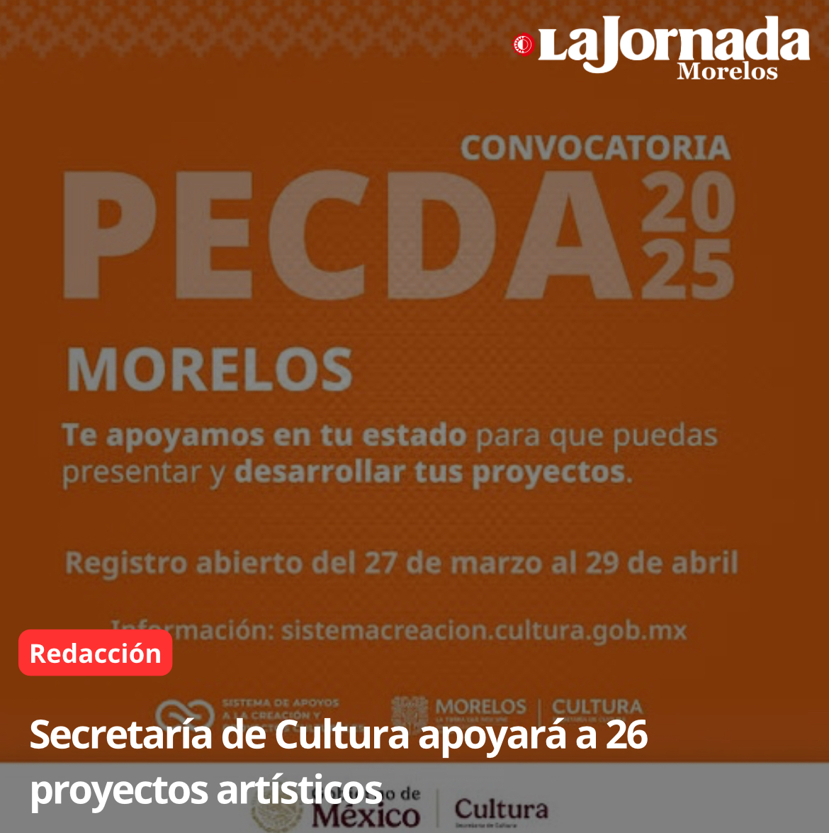 La Secretaría de Cultura del Gobierno de México, a través del Sistema de Apoyos a la Creación y Proyectos Culturales, en colaboración con el Gobierno del Estado de Morelos, a…