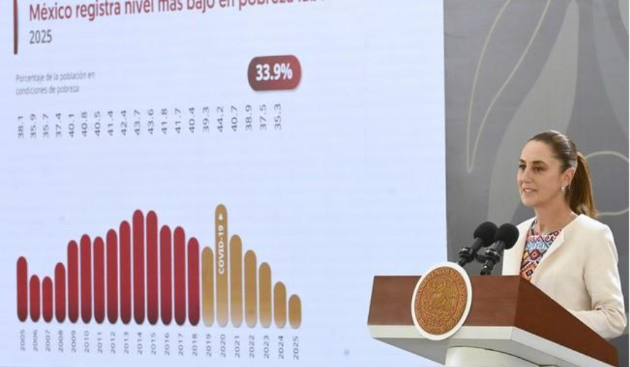 La presidenta de México, Claudia Sheinbaum Pardo, destacó que el país registró durante 2025 el nivel más bajo en pobreza laboral en 20 años, con 33.9 por ciento, de acuerdo…