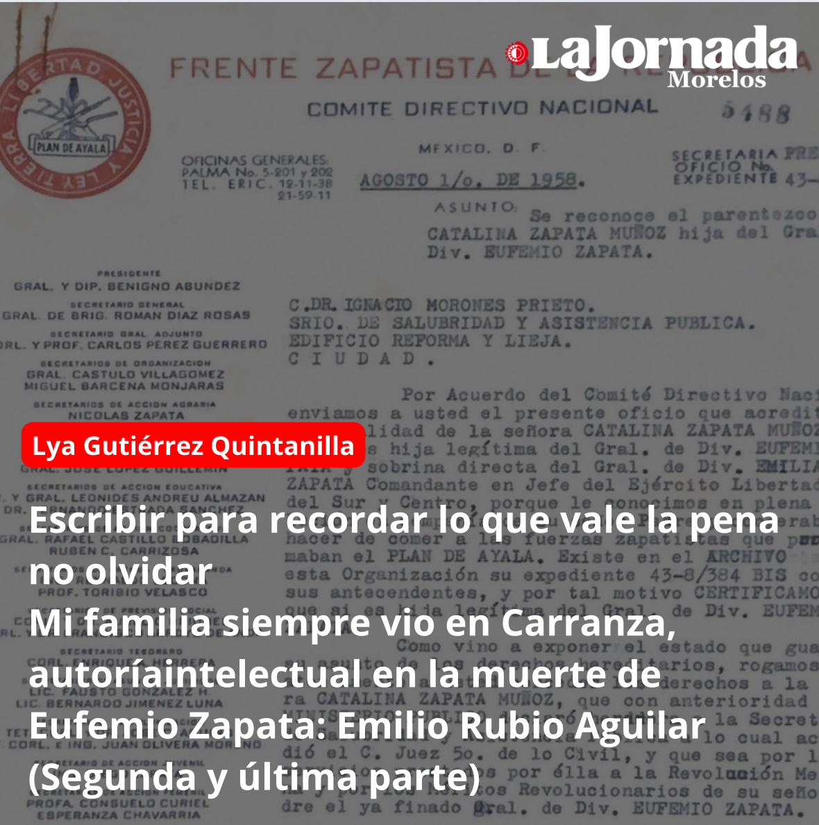 Mi familia siempre vio en Carranza, autoría intelectual en la muerte de Eufemio Zapata: Emilio Rubio Aguilar (Segunda y última parte) Mientras continúo mi entrevista a don Lázaro Emilio Rubio…