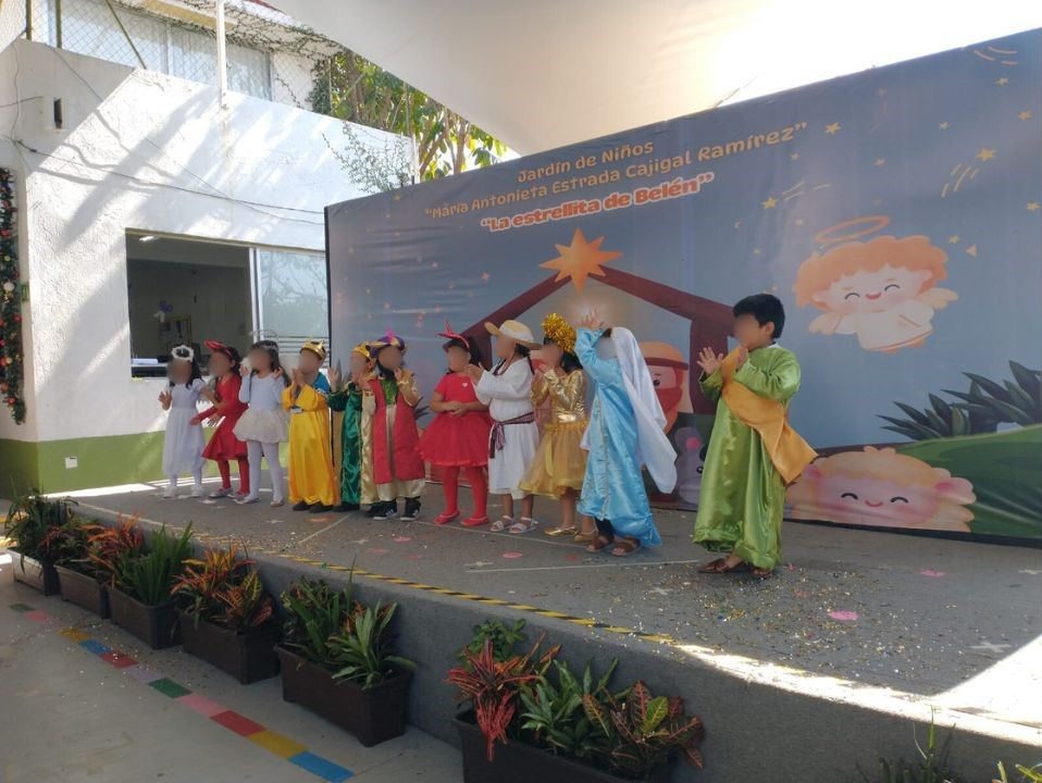Las niñas y niños del Jardín de Niños María Antonieta Estrada Cajigal Ramírez presentaron la pastorela “La estrellita de Belén” frente a madres y padres de familia que se sumaron a la celebración, que promueve la convivencia, el arraigo a las tradiciones y el fortalecimiento de los valores propios de la temporada decembrina.