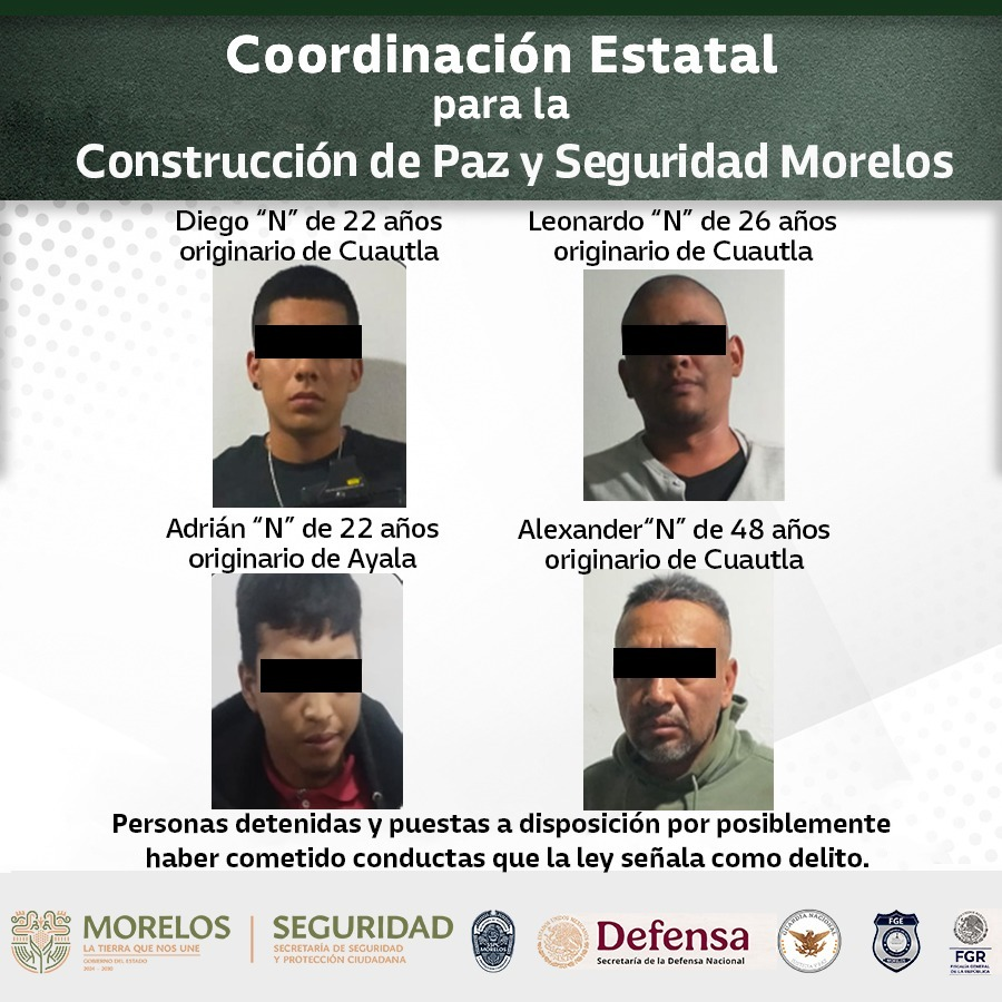 Además de Adrián “N”, de 22 años originario de Ayala, con antecedentes por delitos contra la salud, asociación delictuosa y portación de arma de fuego y explosivos; así como Alexander “N” de 48 años, originario de Cuautla, sin antecedentes penales.