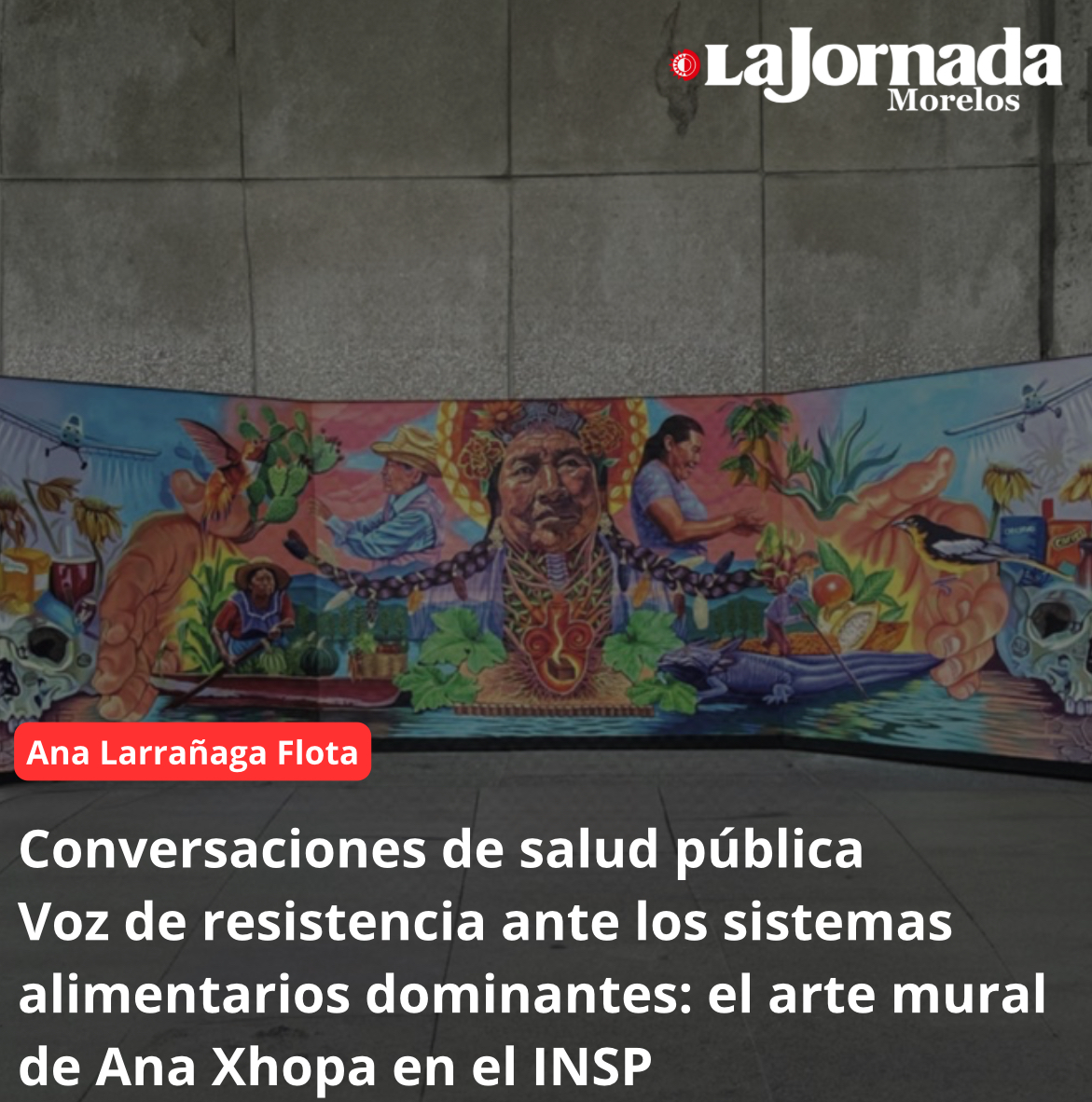 Como parte de una exposición itinerante, el pasado 24 de mayo el Instituto Nacional de Salud Pública (INSP) abrió las puertas de su sede principal en Cuernavaca, Morelos, a la obra mural de Ana Xhopa, destacada artista visual zapoteca, originaria de San Blas Atempa, Oaxaca. Bajo el título Arte público contra la captura corporativa: nuestros alimentos, nuestra salud, nuestro ambiente, la obra surge como crítica y voz de resistencia frente a los sistemas alimentarios dominantes. Con estos últimos nos referimos a aquellos que, sin respeto por la tierra, por las familias campesinas y por la salud de la población, inundan nuestros campos de glifosato y nuestros entornos alimentarios de productos ultraprocesados y bebidas azucaradas.