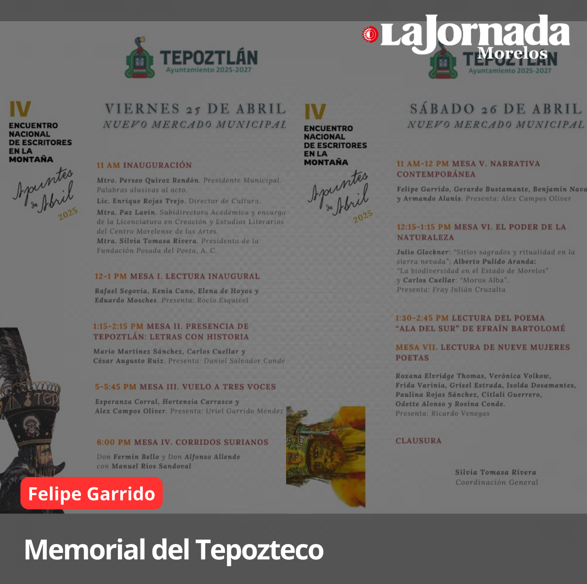 El viernes 25 y el sábado 26 de abril se celebró en Tepoztlán, en su Nuevo Mercado Municipal, con el generoso apoyo del Ayuntamiento de la ciudad, el IV Encuentro Nacional de Escritores en la Montaña. Coordinado, como los tres anteriores, por la poeta y activísima promotora cultural Silvia Tomasa Rivera, este encuentro congregó a un público entusiasta y nutridísimo. En ese marco festivo y gozoso leí, entre otros, los cuentos que siguen.