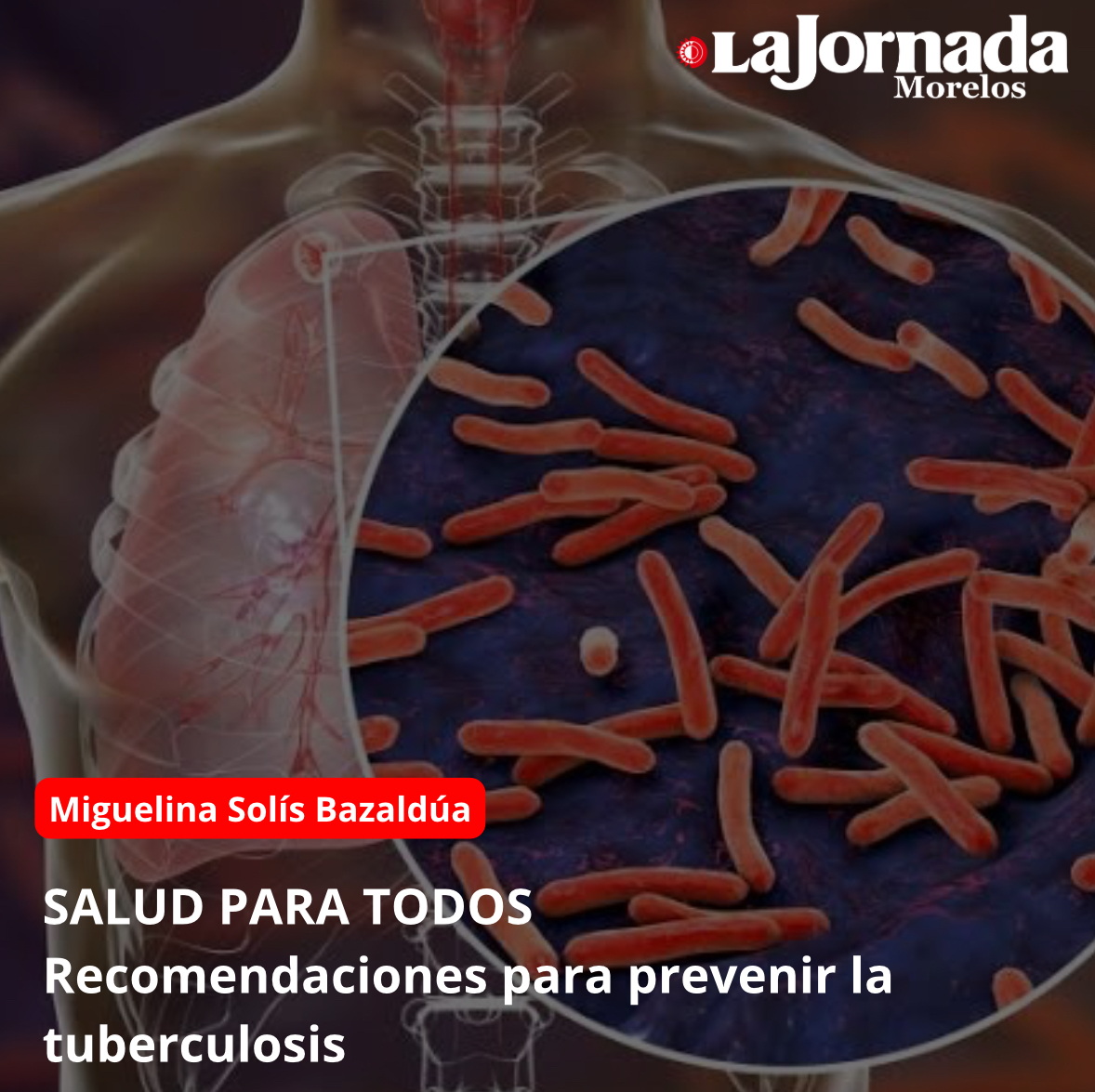 La tuberculosis (TB) es una enfermedad infecciosa, se contagia de una persona enferma a otra sana por la inhalación de gotas de flügge que se esparcen en el aire, se introducen por la nariz o por la boca y llegan hasta los pulmones dando lugar a un proceso infeccioso. Ataca al estado general y de no tratarse oportuna y eficientemente puede causar la muerte a quien la padece.