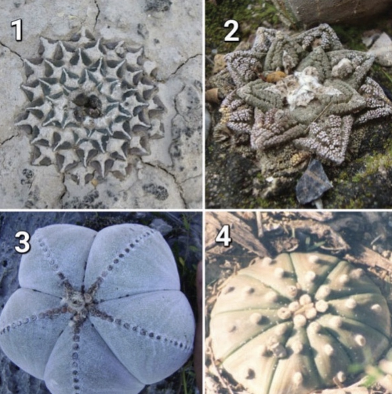 Los Astrophytum son un género de cactus con cincoespecies: A. ornatum, A. asterias, A. myriostigma, A. capricorne, A. caput-medusae. Con excepción de la última, todos tienen formas estrelladas. Otros cactus en forma de estrella son los Ariocapus kotschoubeyanus y los Ariocapus bravoanus. (Ver foto)