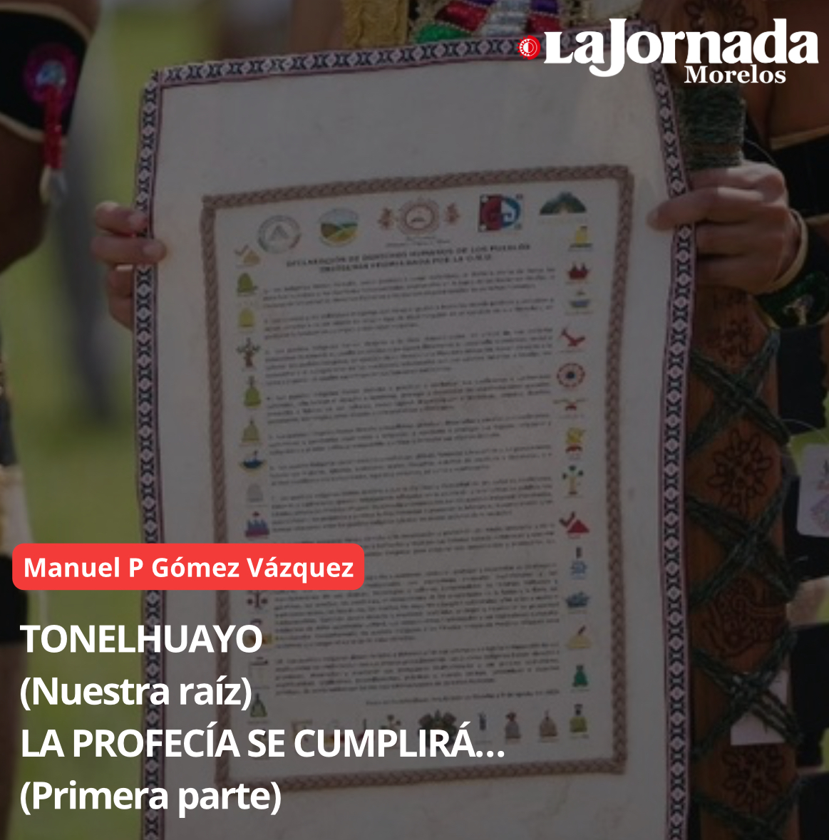 En ese marco fue presentado el documento elaborado en papel amate (códice), que contenía escrito “La Declaración Universal de los Derechos Humanos de los Pueblos Originarios”, custodiado por dos Guerreros Águila, una mujer (cíhuatl) y otro varón (tlácatl), quienes representaban esa fuerza de la dualidad cósmica, los dos polos energéticos (positivo, negativo), el arriba y el abajo, el día y la noche, el oriente y el poniente, el norte y el sur, el aquí y el ahora, éstos estaban ricamente ataviados con sus finas ropas (máztlatl), sus copillis (penachos con auténticas plumas de pavo real) y portando sus emblemáticas makuáhuitl (mano de madera), el arma sagrada y noble de nuestros antiguos guerreros, o como la llamaron los extranjeros la “espada de madera con navajas de obsidiana”. Estos guerreros entregaron el importante documento, con enorme respeto y la reverencia protocolaria, al Gobernador Indígena, quien asistido de los maestros encargados de la ceremonia tradicional y sagrada, procedieron al ritual especial para que fuera consagrado, al compás de los rezos, peticiones, las danzas, el humo del copal y los sonidos del huéhuetl, coyoleras y el fuerte sonido del caracol (atecocolli). Fue ahí donde se pidió la fuerza, la luz y la energía para que ese documento, ahora sagrado, cumpliera su misión como emblema y embajador de los pueblos originarios ante el mundo.