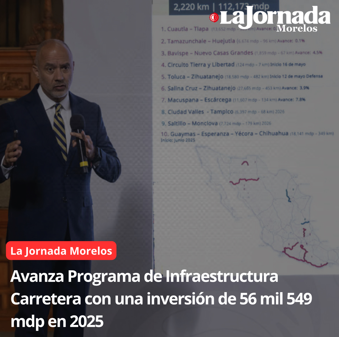 El Gobierno de México, a través de la Secretaría de Infraestructura, Comunicaciones y Transportes (SICT), informó los avances del Programa de Infraestructura Carretera, que en 2025 contempla una inversión de 56 mil 549 millones de pesos (mdp) y la generación de 162 mil 93 empleos directos e indirectos. Mientras que, para todo el sexenio, se destinarán 369 mil 814 mdp para la construcción y modernización de carreteras, puentes, distribuciones viales, caminos artesanales, así como acciones de bacheo y repavimentación, lo que creará un millón 109 mil 442 empleos directos e indirectos.