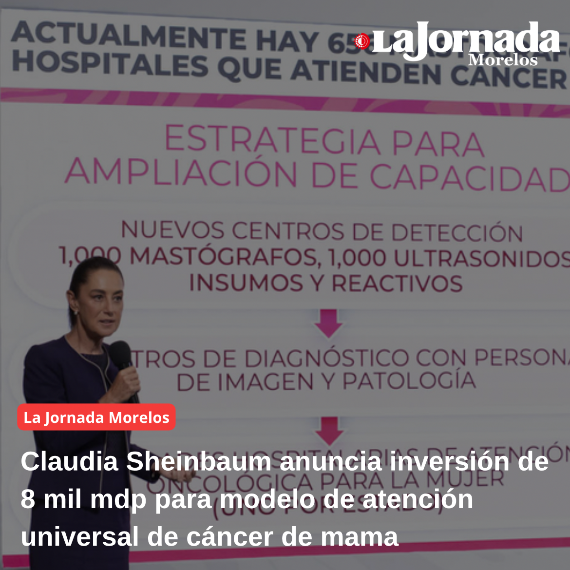 La presidenta Claudia Sheinbaum Pardo anunció una inversión de 8 mil millones de pesos (mdp) que se destinará al Modelo de Atención Universal de Cáncer de Mama, que marcará un antes y un después en la atención de esta enfermedad, que en México es la principal causa de muerte en mujeres, y para ello se adquirirán, entre 2026 y 2027, mil mastógrafos, mil ultrasonidos, —que se sumarán a los 656 mastógrafos que ya están en operación en 640 hospitales—, que estarán en los Nuevos Centros de Detección, además se abrirán 20 Centros de Diagnóstico con personal de imagen y patología para la interpretación de los estudios y se construirán 32 Unidades Hospitalarias de Atención Oncológica para la mujeres, uno en cada estado.
