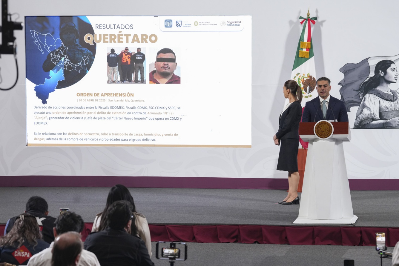 El secretario de Seguridad y Protección Ciudadana, Omar García Harfuch, informó que, en siete meses de la administración de la Presidenta Claudia Sheinbaum, del 1 de octubre de 2024 al 6 de mayo de 2025, se han detenido más de 20 mil personas por delitos de alto impacto, se han asegurado 154 toneladas de droga y más de 10 mil armas de fuego. Además, en 19 estados, el Ejército y la Marina destruyeron 896 laboratorios clandestinos y áreas de concentración de elaboración de metanfetaminas, asegurando más de un millón de litros y más de 200 toneladas de sustancias químicas.