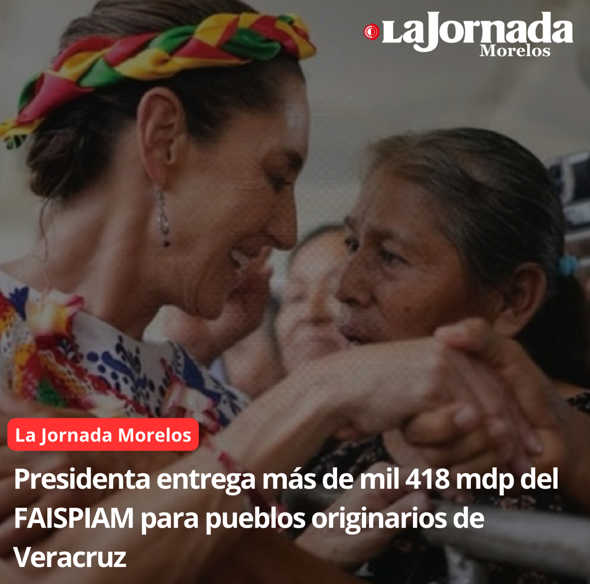 La Presidenta Claudia Sheinbaum Pardo realizó la entrega de mil 418 millones de pesos (mdp) del Fondo de Aportaciones para la Infraestructura Social a Pueblos Indígenas y Afromexicanos (FAISPIAM) para el beneficio de más de 2 mil 500 comunidades en el estado de Veracruz; un recurso que será para siempre ya que así lo establece el artículo 2 de la Constitución Política de México.