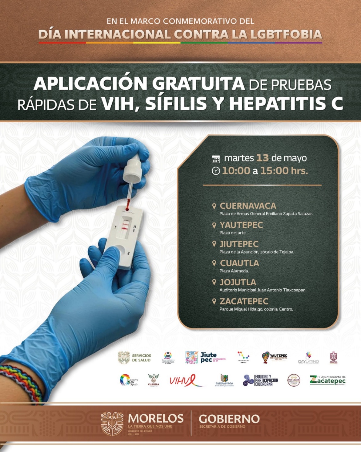 Las secretarías de Gobierno y de Salud y Servicios de Salud de Morelos (SSM); la Coordinación Estatal de VIH, Colectivos y los municipios de Cuernavaca, Jiutepec, Cuautla, Yautepec, Jojutla y Zacatepec, llevarán a cabo el próximo 13 de mayo de 10:00 a 15:00 horas la jornada “Pruebatón: La prueba es la clave», donde se aplicarán de manera gratuita pruebas rápidas de VIH, Sífilis y Hepatitis C, en la explanada de cada ayuntamiento.