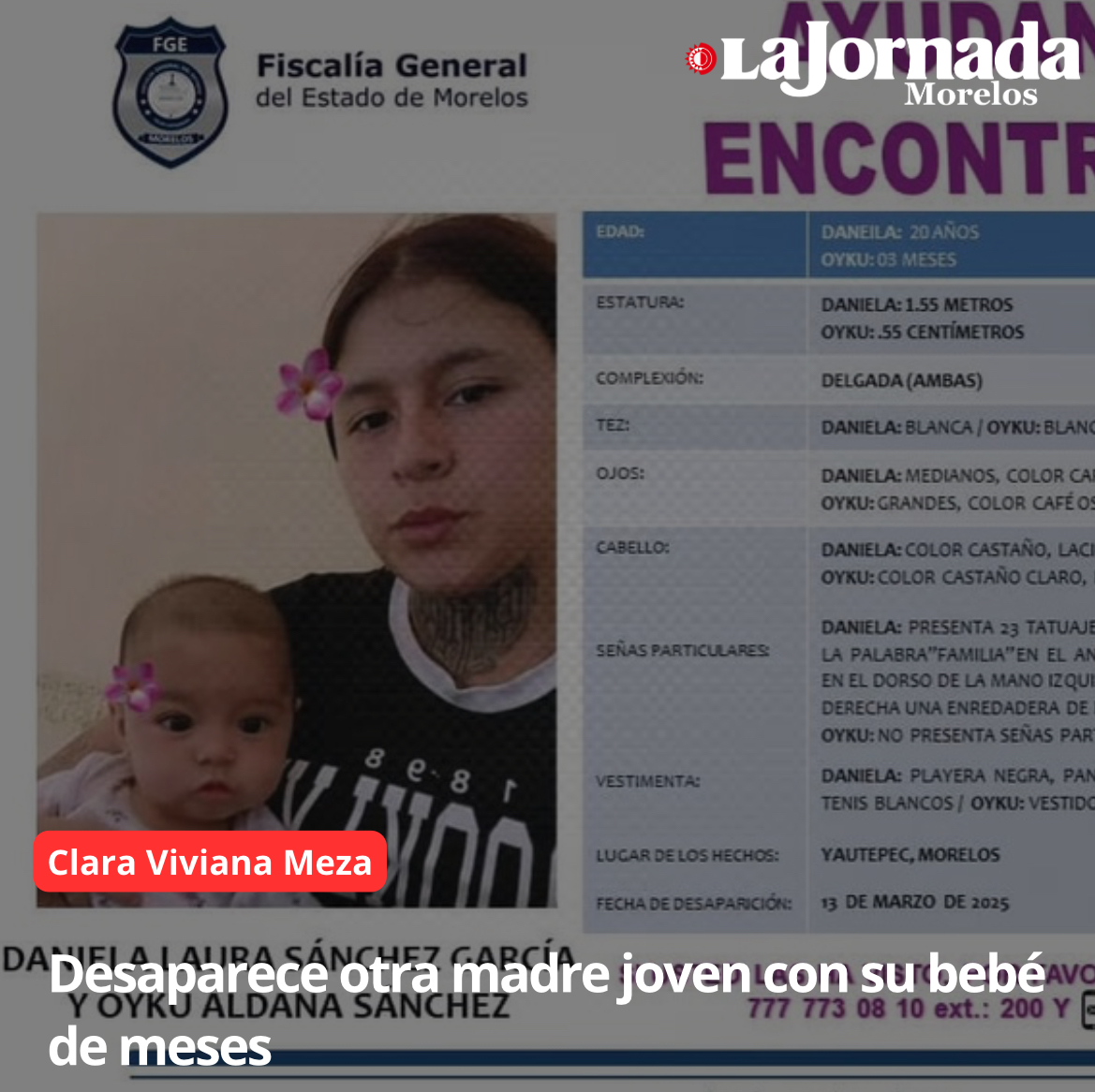 Daniela Laura Sánchez García, de 20 años, fue vista por última vez con su bebé de nombre Oyuki Aldana Sánchez, de tres meses de edad, ambas de complexión delgada y tez blanca y hasta el momento no ha habido ninguna comunicación.