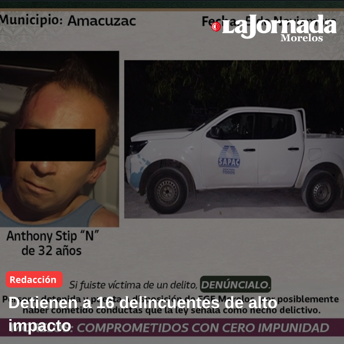 El titular de la SSPC informó también que, derivado de un reporte al 9-1-1 sobre el robo de un vehículo del Sistema de Agua Potable y Alcantarillado de Cuernavaca (SAPAC), se logró la detención de Anthony Stip “N”, de 32 años, en Amacuzac.