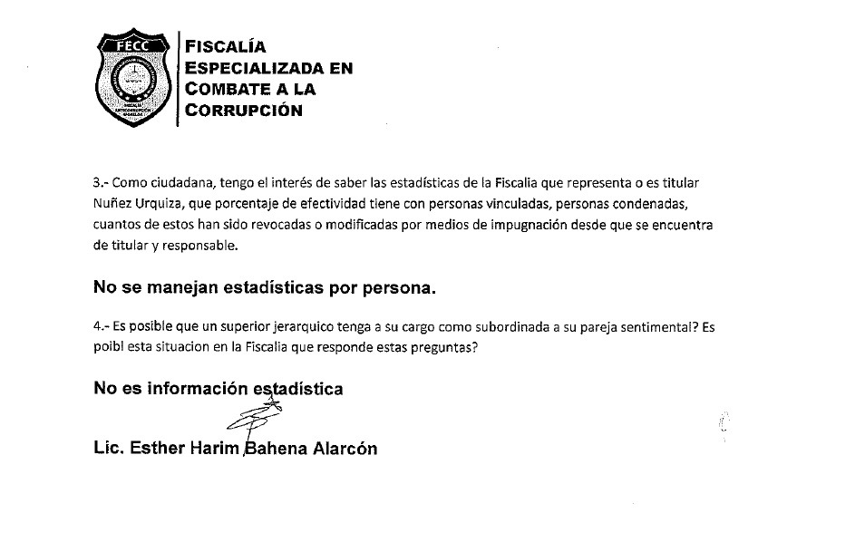 Otra pregunta también fue sobre la supuesta relación de concubinato que mantiene Núñez Urquiza con una de sus subalternas: “¿es posible que un superior jerárquico tenga a su cargo como subordinada a su pareja sentimental? ¿Es posible esta situación en la Fiscalía?”. La contestación fue la siguiente: “No es información estadística”.