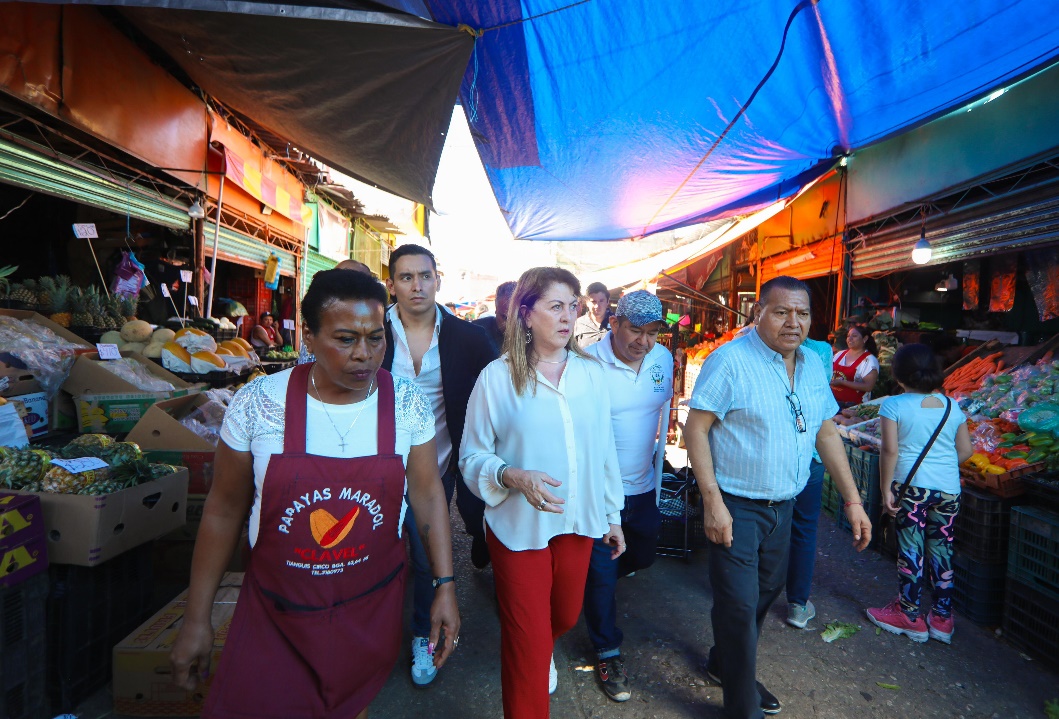 Margarita González Saravia, gobernadora electa de Morelos, recorrió las instalaciones del mercado Adolfo López Mateos en Cuernavaca y compartió con locatarios y líderes de comerciantes el plan integral con el que se renovará la infraestructura de esta central de abastos que el próximo mes de octubre cumple 60 años en funcionamiento.