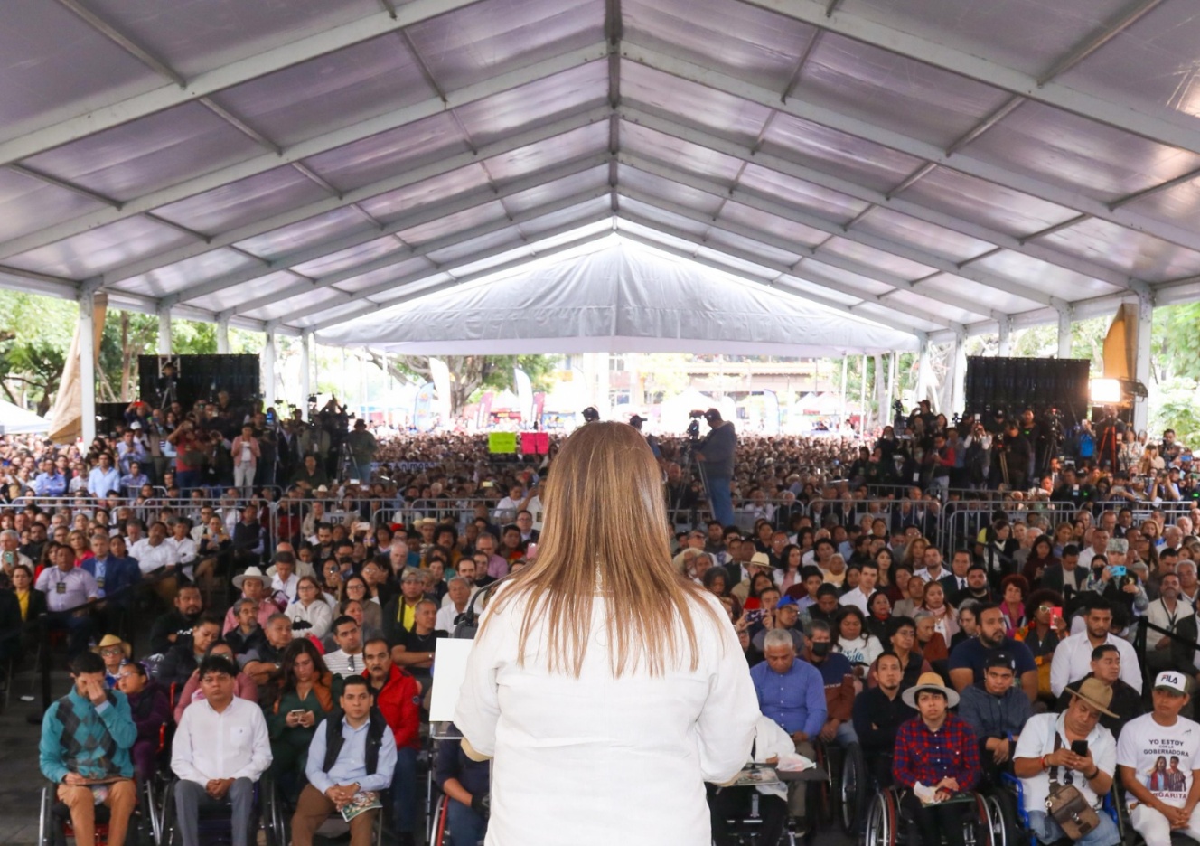 El anuncio de la presencia de la mandataria permitió algo de disciplina en una audiencia que ya se paraba, cambiaba de lugar, sentaba, charlaba, manoteaba para saludar a lo lejos (porque estos actos suelen ser reencuentros entre morelenses). Cualquier cosa menos quedarse quietos, pero la llegada de Margarita González Saravia tuvo el aplauso y abrió el espacio para que el respetable se sentara a ver el acostumbrado video en el que se informaba de cada una de las acciones. Dato distintivo, muchos de los asistentes aplaudieron durante el video, específicamente cuando se hizo mención a las políticas de protección a las mujeres, las acciones a favor de los pueblos indígenas y afromexicanos, el apoyo a la Universidad Autónoma del Estado de Morelos (UAEM), la garantía de aguinaldo a los trabajadores de la educación homologados y jubilados y el Festival Miquixtli.