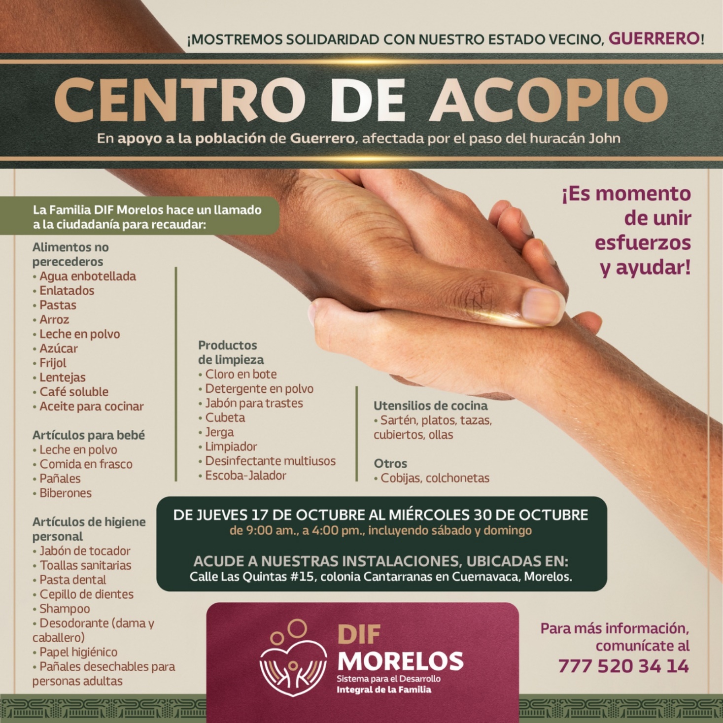Dicho centro de acopio se encuentra en las instalaciones del SEDIF Morelos, ubicadas en calle Las Quintas número 15 de la colonia Cantarranas, en Cuernavaca, donde se estarán recibiendo productos no perecederos a partir de este jueves 17 de octubre y hasta el miércoles 30 del mismo mes, incluyendo sábados y domingos, en un horario de 09:00 a 16:00 horas.