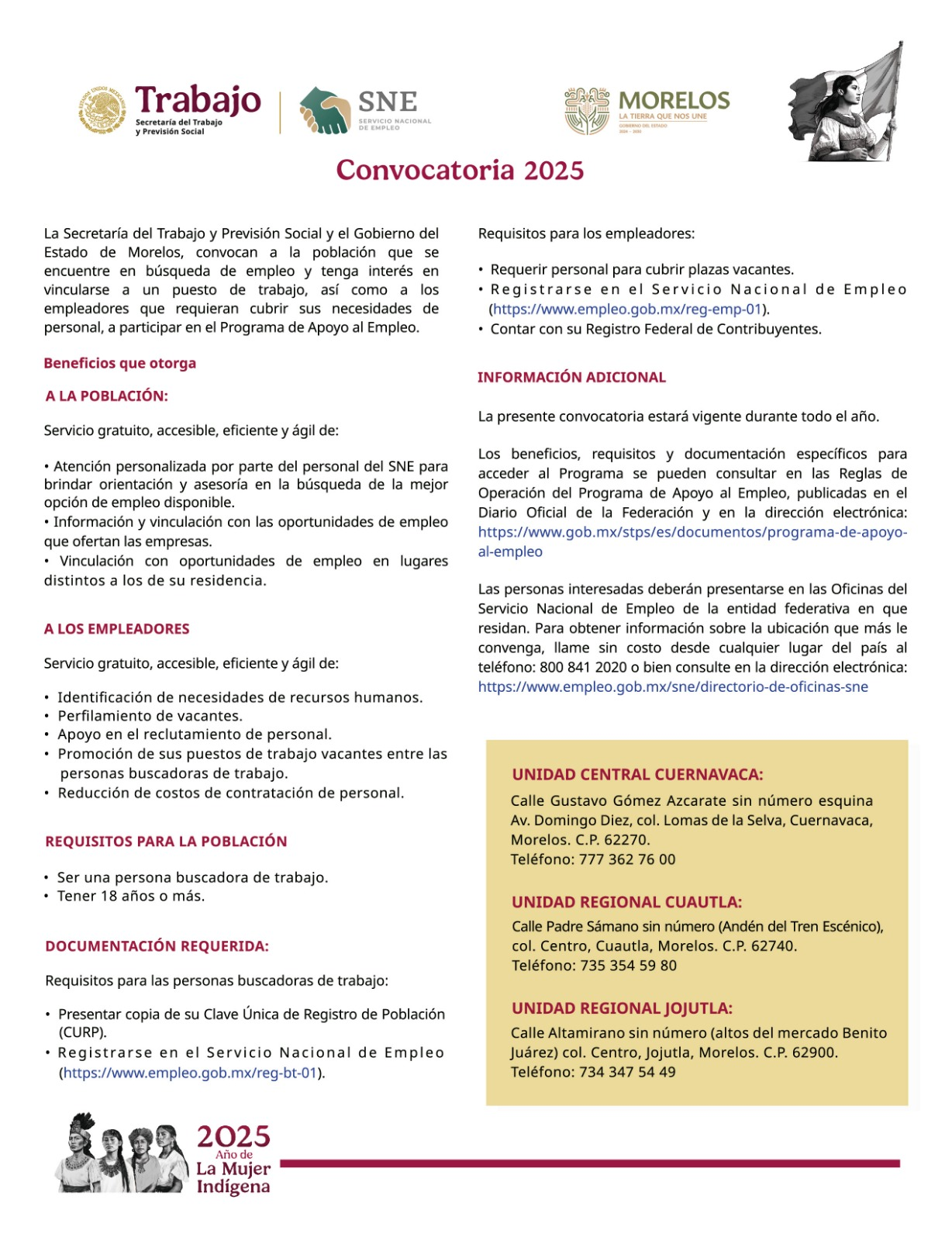 Además, informó que para obtener más información, la ciudadanía puede consultar los canales oficiales del SNE Morelos o comunicarse a los siguientes números telefónicos: 777 362 76 00 para Cuernavaca y zona metropolitana, 734 347 54 49 para Jojutla, zona sur y sur poniente, y finalmente al 735 354 59 80 para la zona oriente y sur oriente.