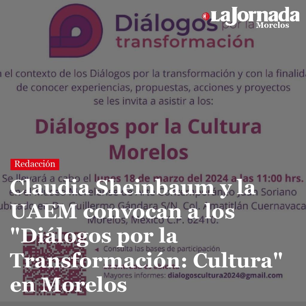 El equipo de campaña de la candidata a la presidencia de la República, Claudia Sheinbaum Pardo, en colaboración con la Universidad Autónoma del Estado de Morelos (UAEM), se enorgullece en anunciar la convocatoria a los «Diálogos por la Transformación: Cultura en Morelos», que tendrán lugar el próximo lunes 18 de marzo en el Museo Morelense de Arte Contemporáneo Juan Soriano a las 11:00 am.