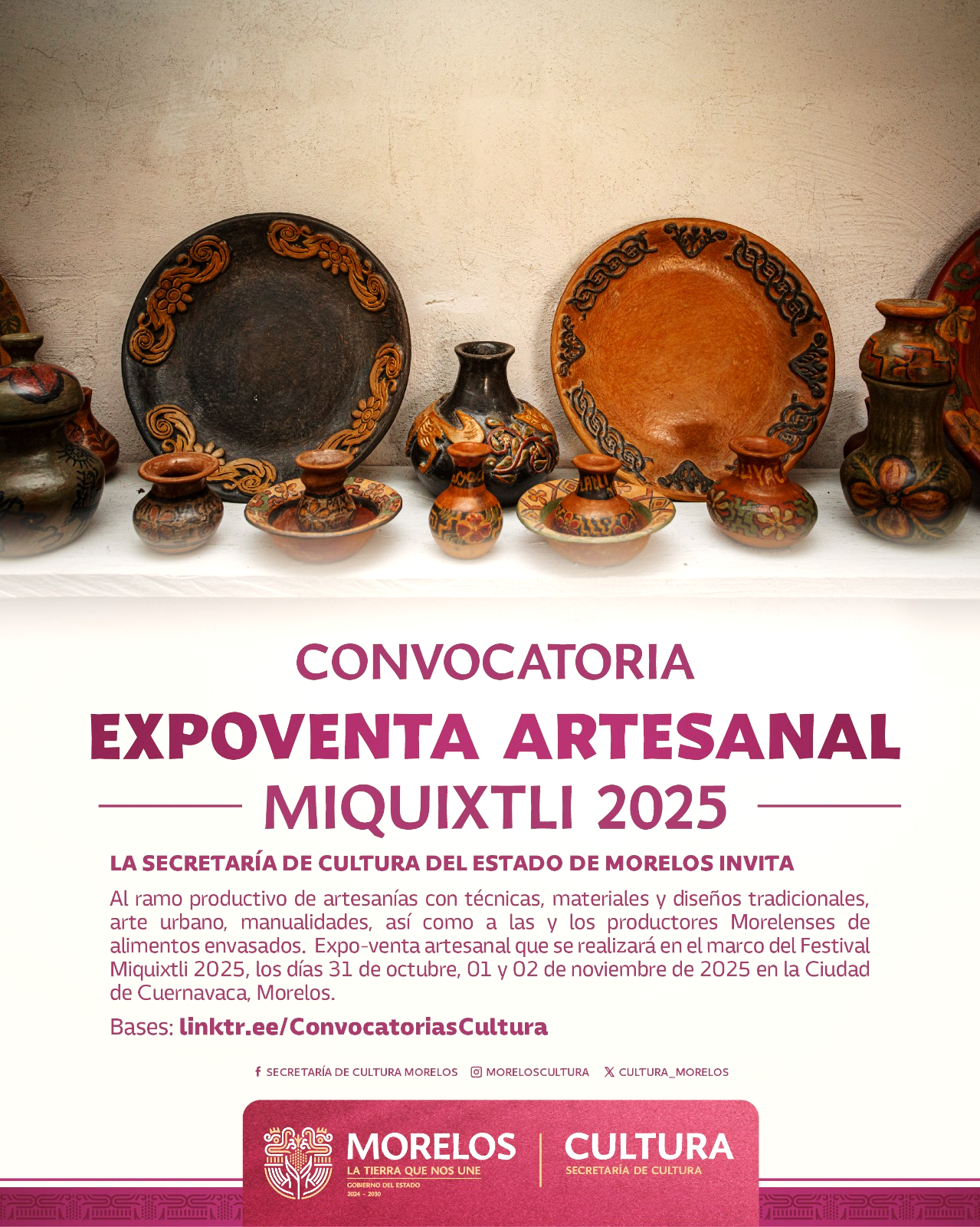 La Secretaría de Cultura de Morelos convocó a participar en la Expoventa Artesanal Miquixtli 2025, que se llevará a cabo el 31 de octubre, 1 y 2 de noviembre, en las instalaciones del Centro Cultural Jardín Borda.