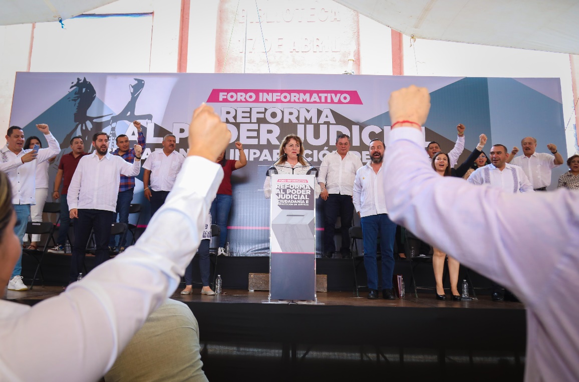 La gobernadora electa, Margarita González Saravia, diputados federales y locales y cientos de simpatizantes de Morena vitorearon la aprobación de la Reforma Judicial en la Cámara de Diputados. Foto: Especial