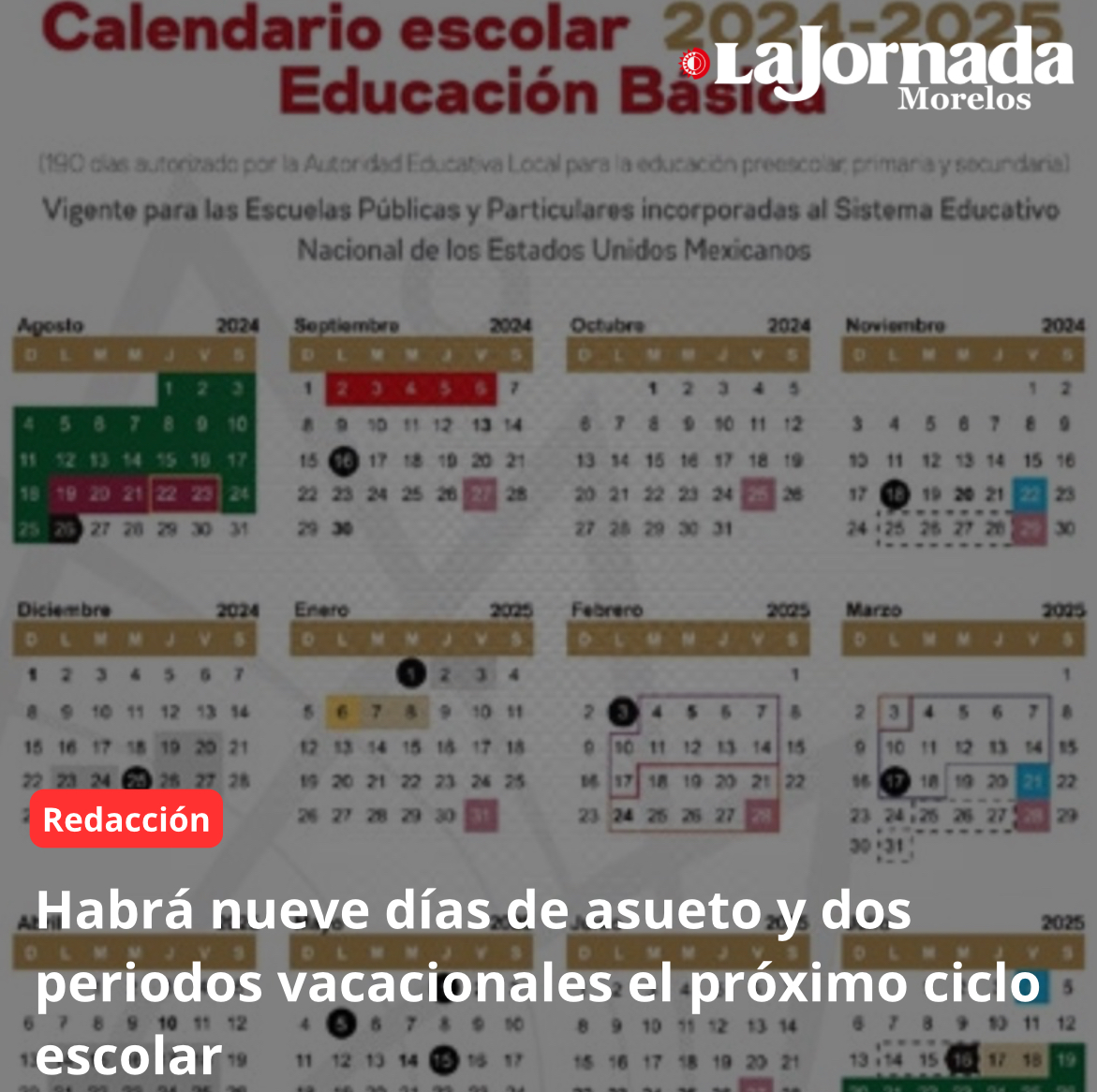 El calendario para el Ciclo Escolar 2024-2025 en Morelos, consta de 190 días de clases aplicables en todos los planteles de Preescolar, Primaria y Secundaria, en el territorio estatal, y de 195 días efectivos de actividades escolares para Educación Normal.