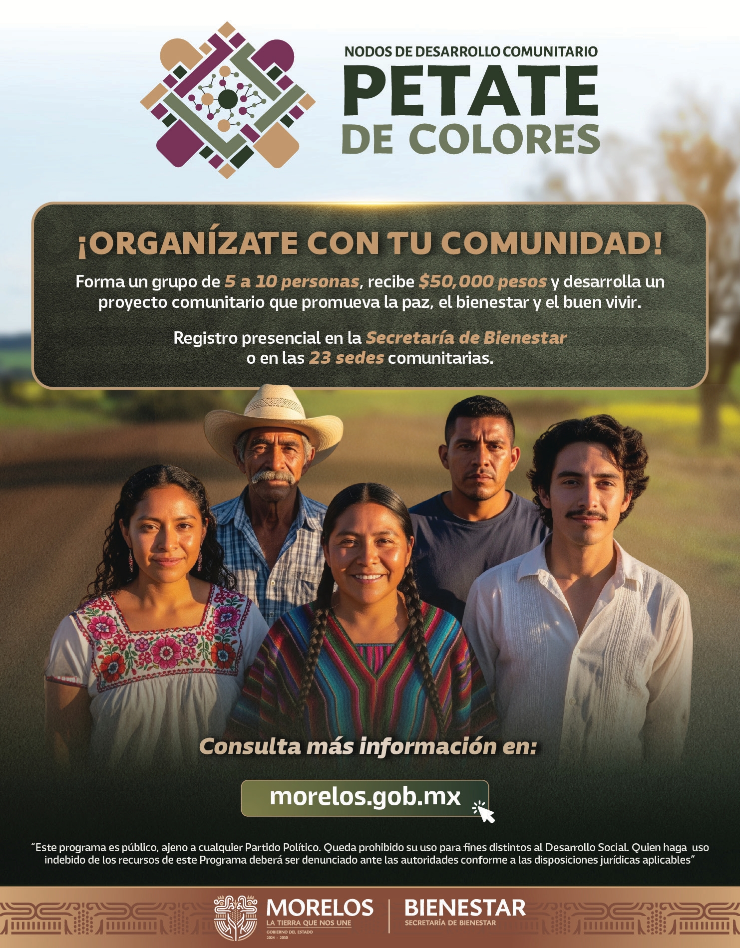 El programa está dirigido a grupos integrados por entre cinco y diez personas, quienes deberán elaborar un proyecto comunitario y cumplir con los requisitos estipulados en las reglas de operación, disponibles en el sitio oficial: www.morelos.gob.mx/bienestar/programas/petate-de-colores