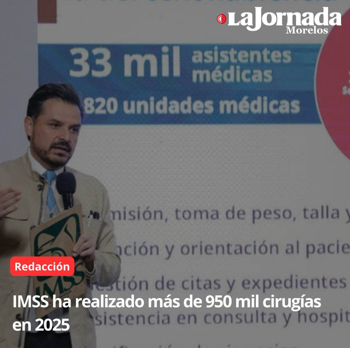 “Mucho de esto se fue trabajando con la rehabilitación de los quirófanos, con nuevas contrataciones, con temas de equipamiento, insumos y demás, y una mucho mejor programación. Entonces queremos reconocer a estos estados que aumentaron de manera considerable su número de cirugías y queremos seguir informando de esto hasta llegar a la meta”, dijo. El director general del Seguro Social refirió que, en el marco de la estrategia, el IMSS celebró por primera vez el Día de la Asistente Médica, junto con el secretario de Salud, doctor David Kershenobich, donde se reconoció la labor de más de 33 mil trabajadoras que integran esta fuerza laboral, distribuidas en mil 820 unidades médicas.