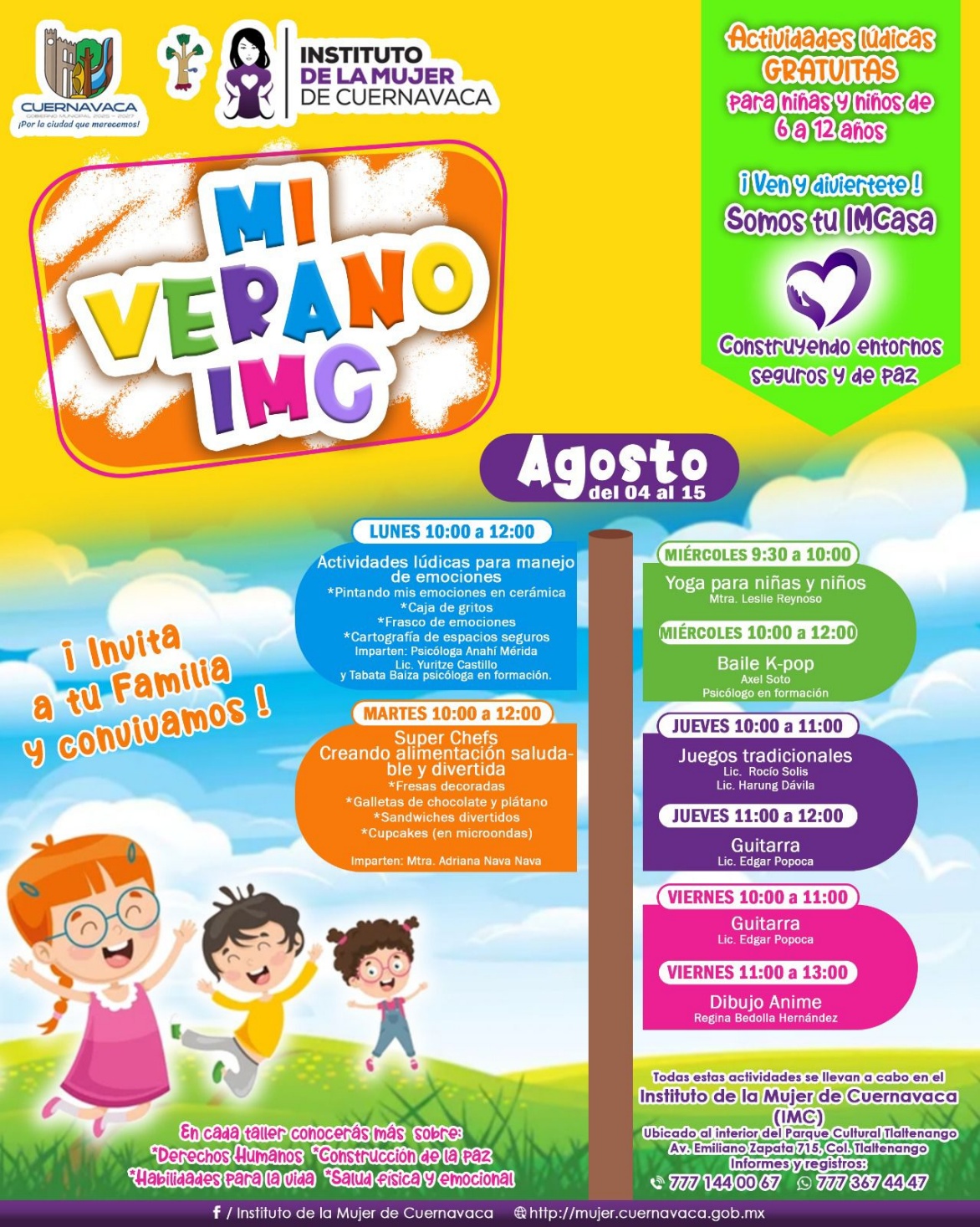 El Instituto de la Mujer de Cuernavaca (IMC) ofrece a niñas y niños de 6 a 12 años los talleres «Mi verano IMC”, como parte de su programa «Construyendo entornos seguros y de paz”, con actividades lúdicas gratuitas del 04 al 12 de agosto.
