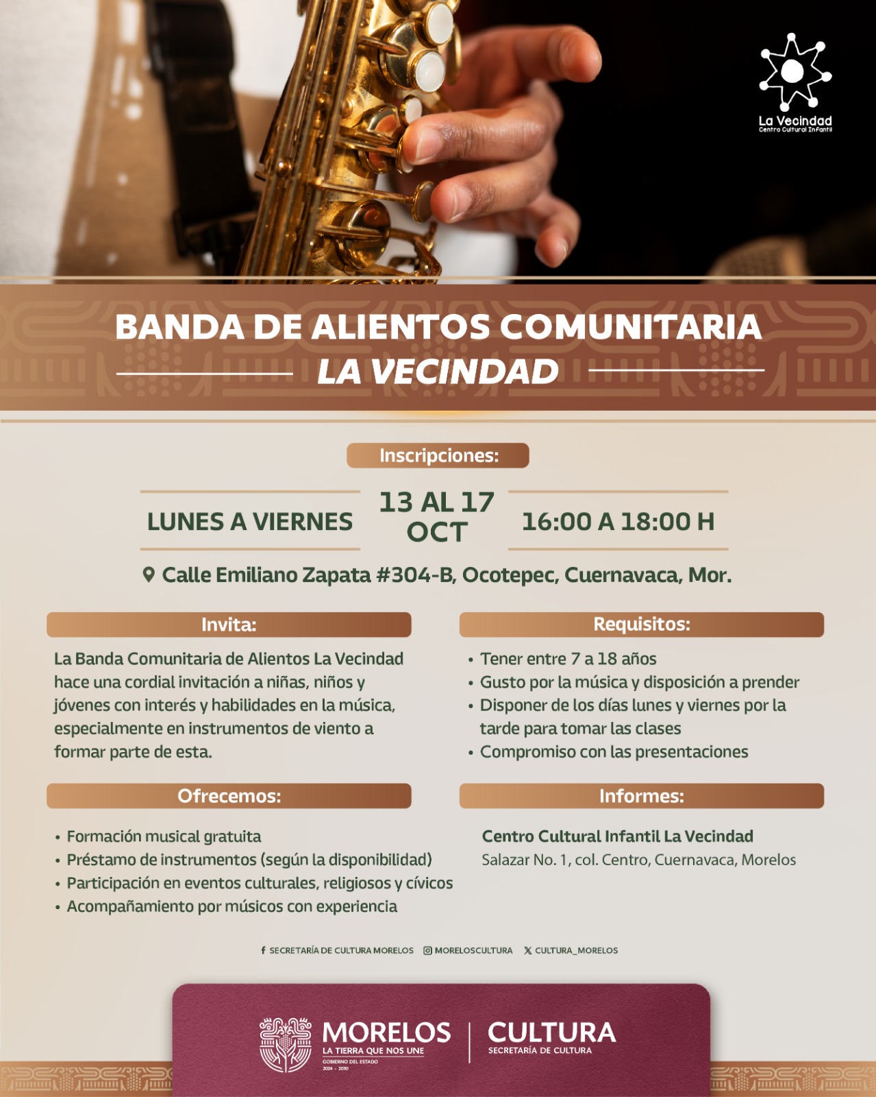 Si te gusta la música, tienes entre 7 y 18 años, y sueñas con tocar en una banda, ¡ésta es tu oportunidad! La Secretaría de Cultura de Morelos invita a niñas, niños y jóvenes a formar parte de la Banda Comunitaria de Alientos “La Vecindad”, un espacio gratuito de formación artística e inclusión que tiene como sede el poblado de Ocotepec.