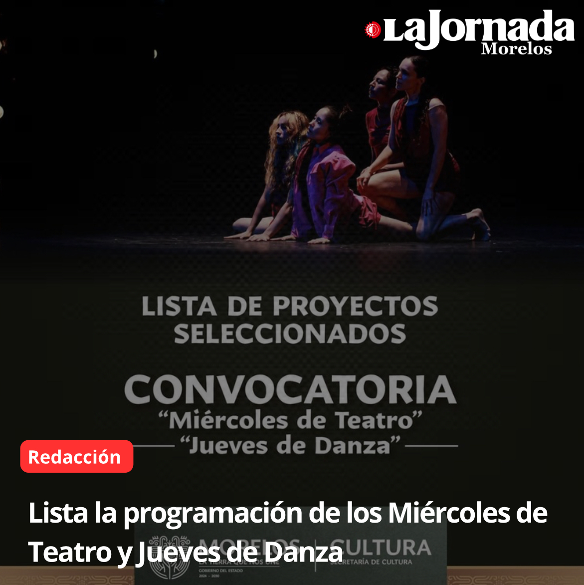 La Dirección General de Fomento a las Artes de la Secretaría de Cultura de Morelos dio a conocer los resultados de participación de la convocatoria de programación de artes escénicas “Miércoles de Teatro y Jueves de Danza”, iniciativa creada para difundir y visibilizar el trabajo de artistas escénicos radicados en la entidad, así como promover el acceso equitativo a expresiones culturales en distintos municipios del estado.