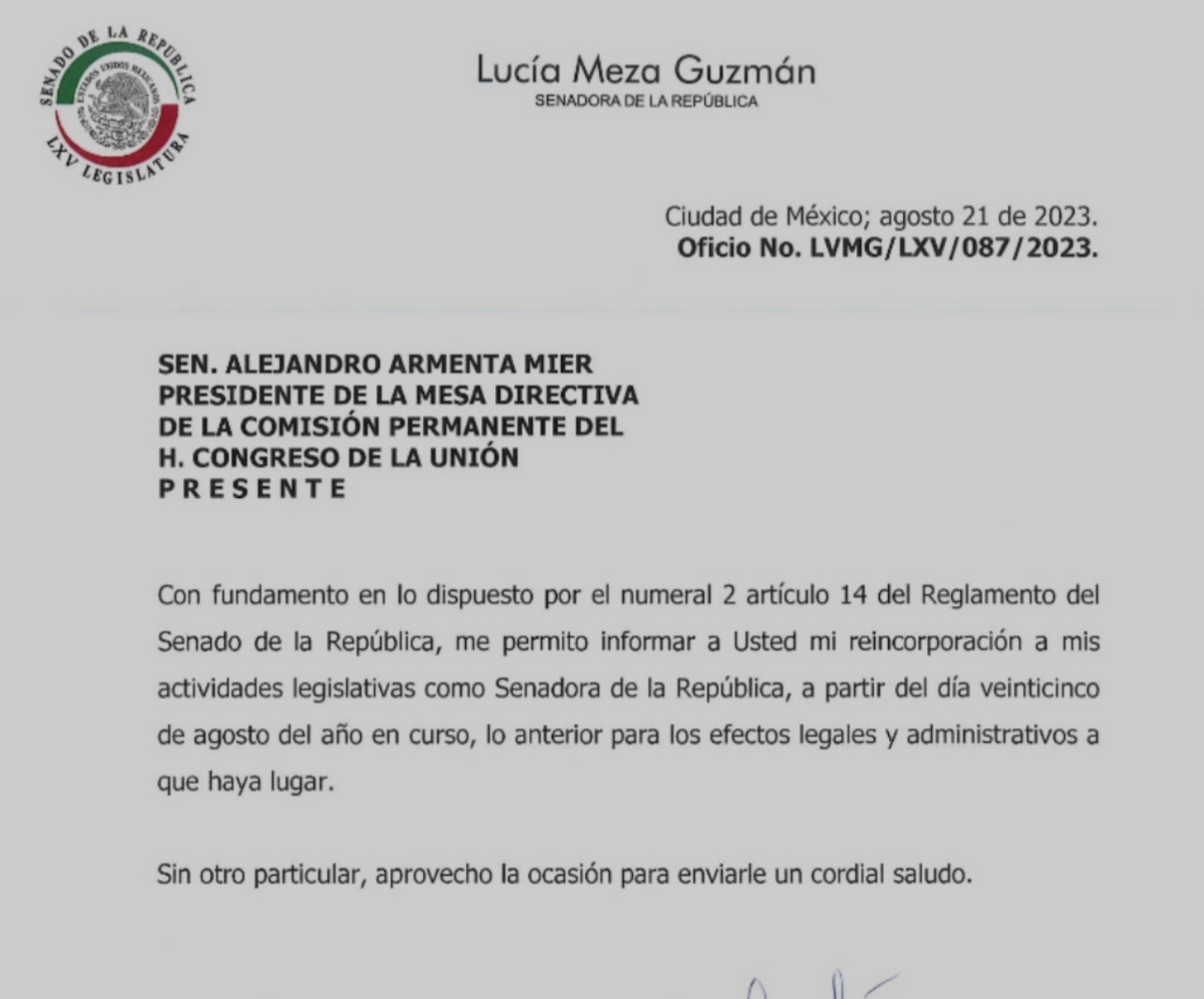 Tras menos de dos meses de haber pedido licencia como senadora de la República, Lucy Meza informó que regresa a sus actividades legislativas para estar en posibilidades de participar en la elección de la próxima presidenta o presidente de la Mesa Directiva del Senado de la República y para defender desde ahí “los proyectos legislativos del presidente López Obrador y de la 4T”.