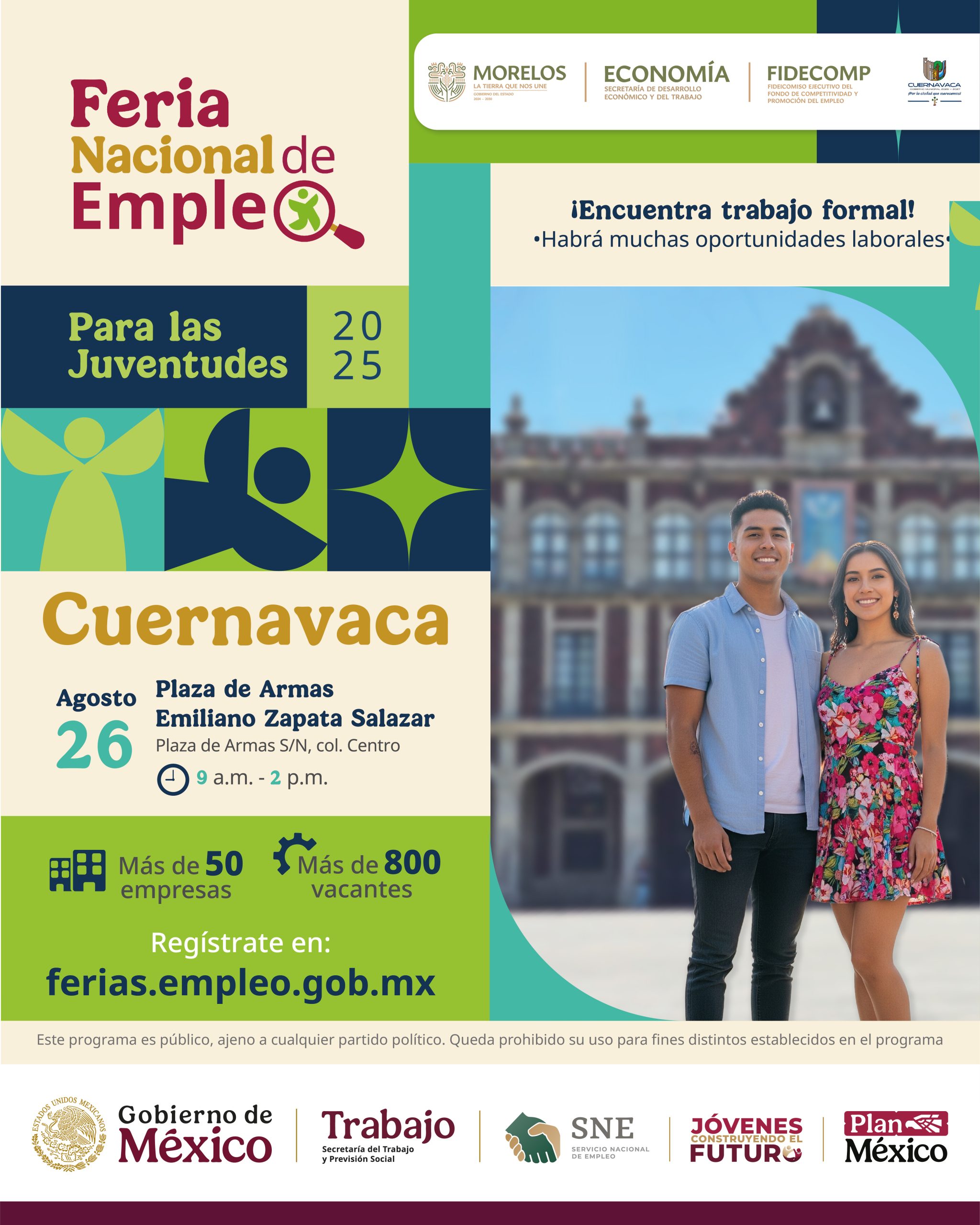 Con el cierre del Mes de las Juventudes, el Gobierno de Morelos anunció la Feria Nacional de Empleo para las Juventudes Cuernavaca 2025, que se llevará a cabo el próximo martes 26 de agosto, de 9:00 a 14:00 horas, en la Plaza de Armas General Emiliano Zapata Salazar.