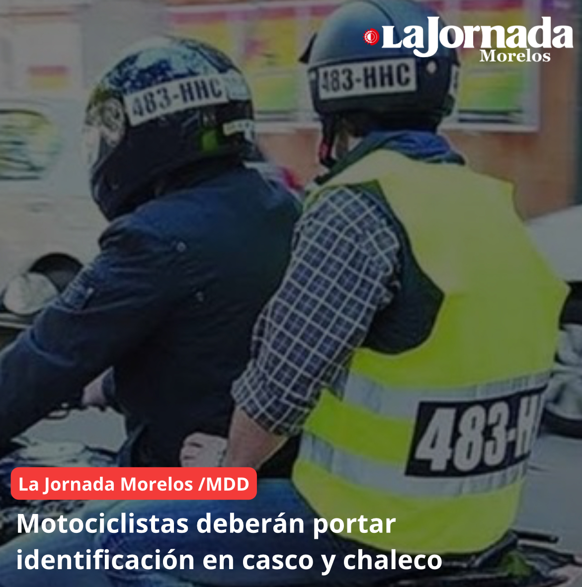 La consejera jurídica del gobierno de Morelos, Dolores Álvarez Díaz, informó que la iniciativa de reforma que obligará a los motociclistas que circulen en Morelos a portar placas y el número de ellas en casco y chaleco ya fue presentada al Congreso local y se espera su aprobación en el próximo periodo ordinario de sesiones, que inicia el 1 de septiembre próximo.