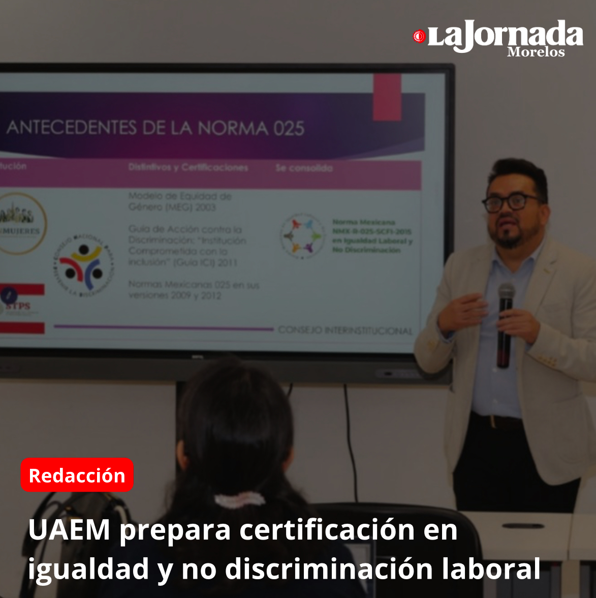 Asimismo, informó al personal de la UAEM que la certificación de la Norma Mexicana para la Igualdad Laboral y No discriminación es emitida por un Consejo Interinstitucional integrado por la Secretaría del Trabajo y Previsión Social (STPS), el Instituto Nacional de las Mujeres (Inmujeres) y el Consejo Nacional para Prevenir la Discriminación (Conapred).
