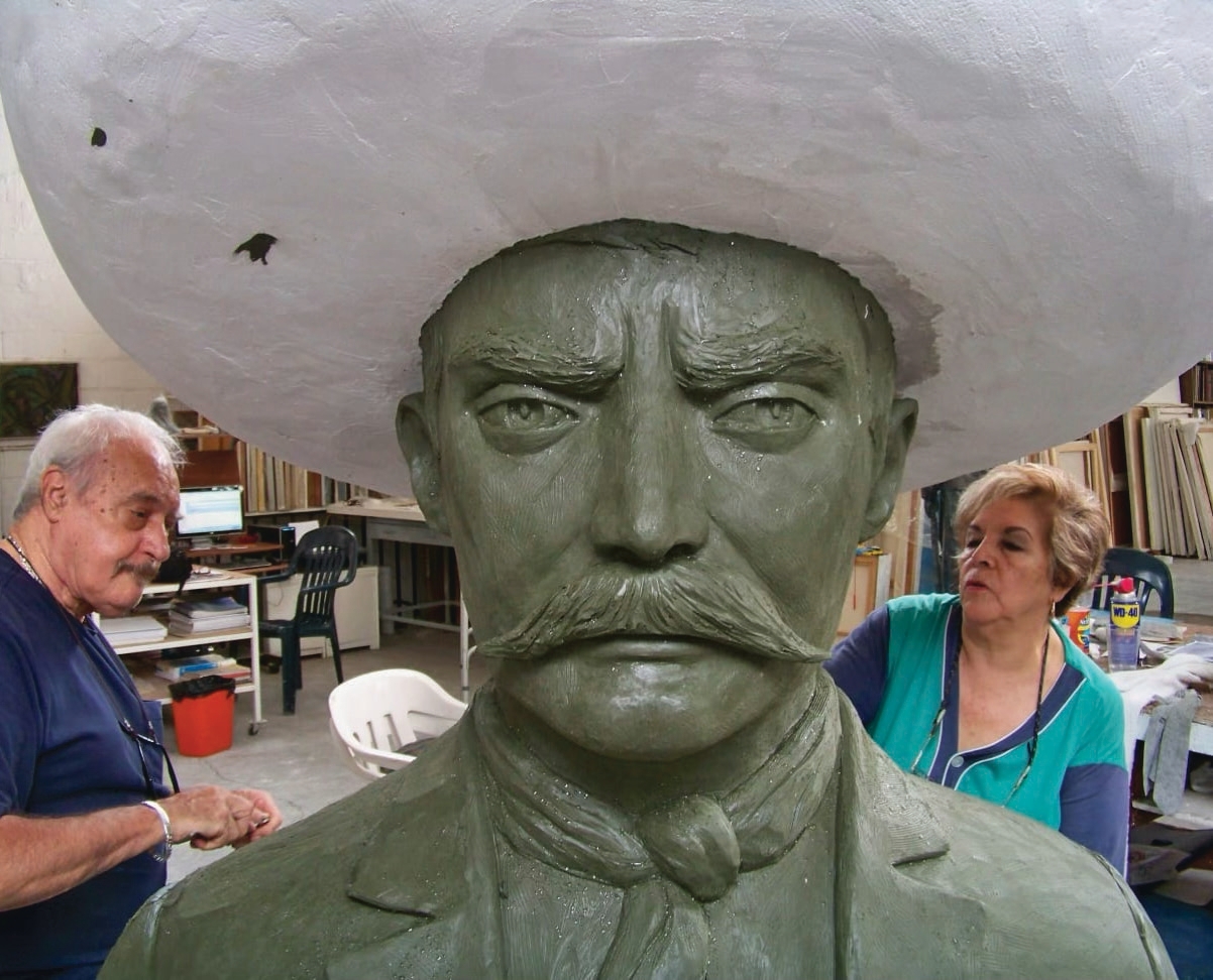 Carlos Kunte y Estala Ubando en su taller, trabajado en una escultura de Zapata de pie. Foto: Carlos Kunte hijo.