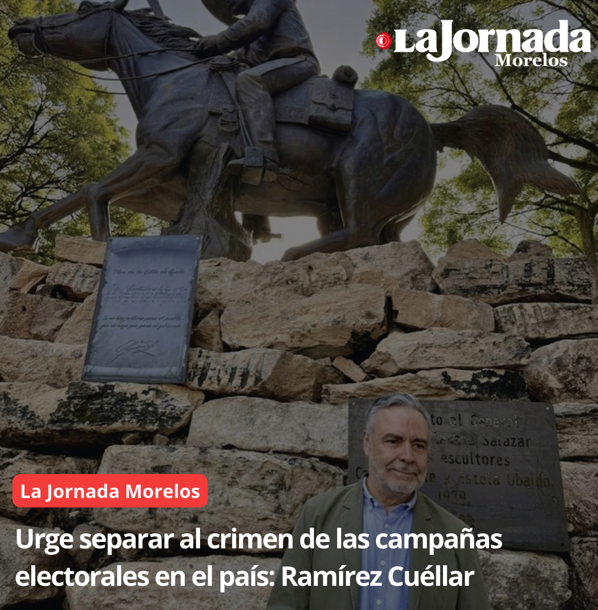 El vicecoordinador de Morena en la Cámara de Diputados, Alfonso Ramírez Cuéllar, frente a la recién develada estatua ecuestre de Emiliano Zapata en el centro de Cuernavaca. Foto: Cortesía