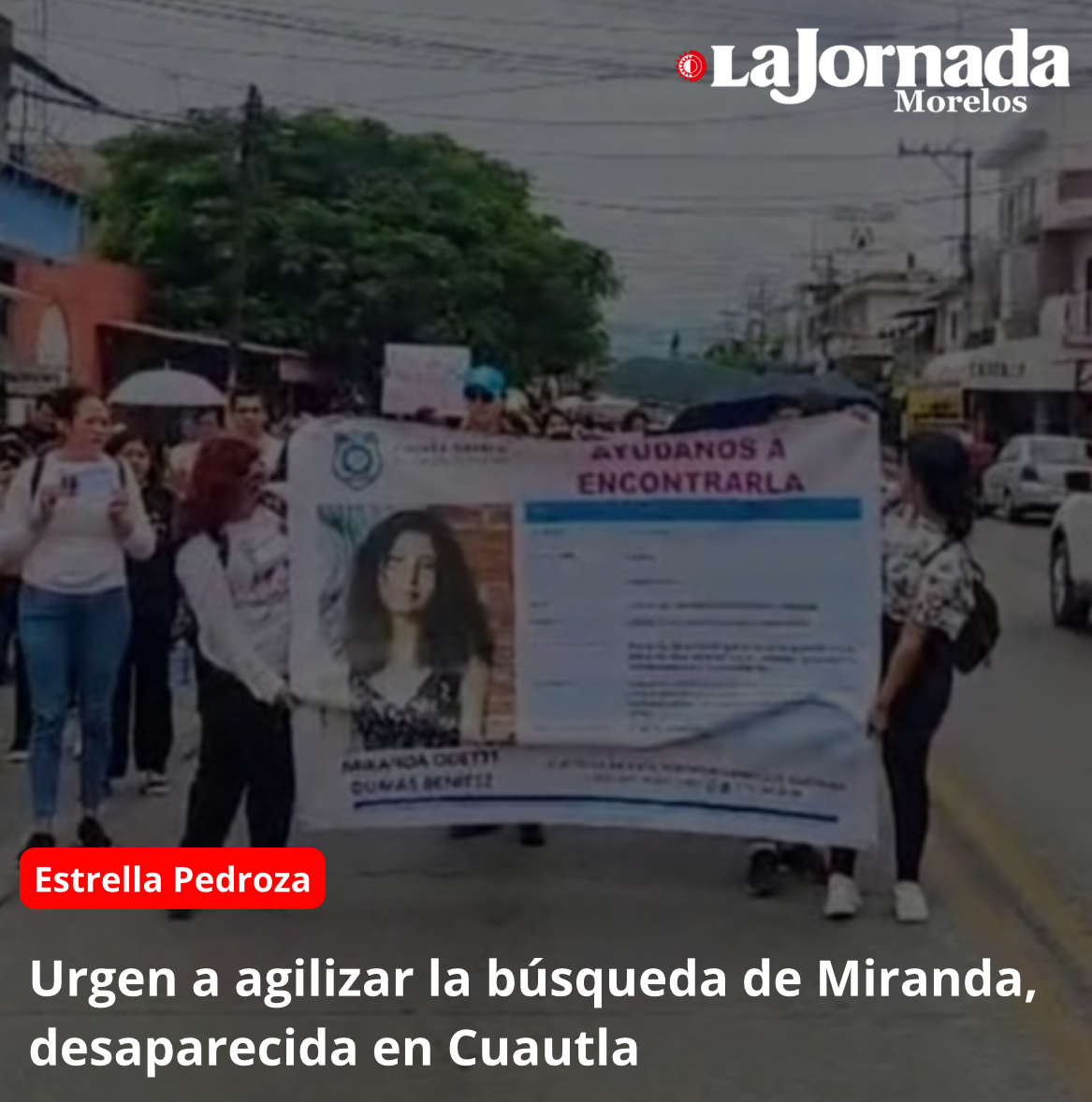 Ya han pasado ocho días y la familia Dunas Benítez sigue sin noticias. “El tiempo pasa y no sabemos nada de mi hija yo le pido a las autoridades que agilicen la búsqueda e investigaciones ”, expresó Blanca durante la protesta realizada por las principales calles de Cuautla y convocada por las y los compañeros de prepa de Miranda.